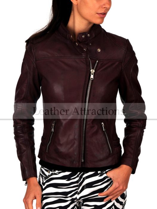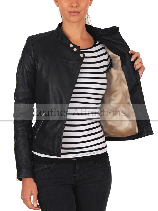 Roam wild and free in this cool women's leather motorcycle jacket. This sleek, casual motorcycle inspired zip-front jacket has a cool banded collar with a snap as well as two convenient and stylishly configured front pockets. This soft, black leather topper is inspired by bikers but is also totally feminine, offers protection and comfort with a fitted silhouette. Smart, modern and perfect for year-round wear.